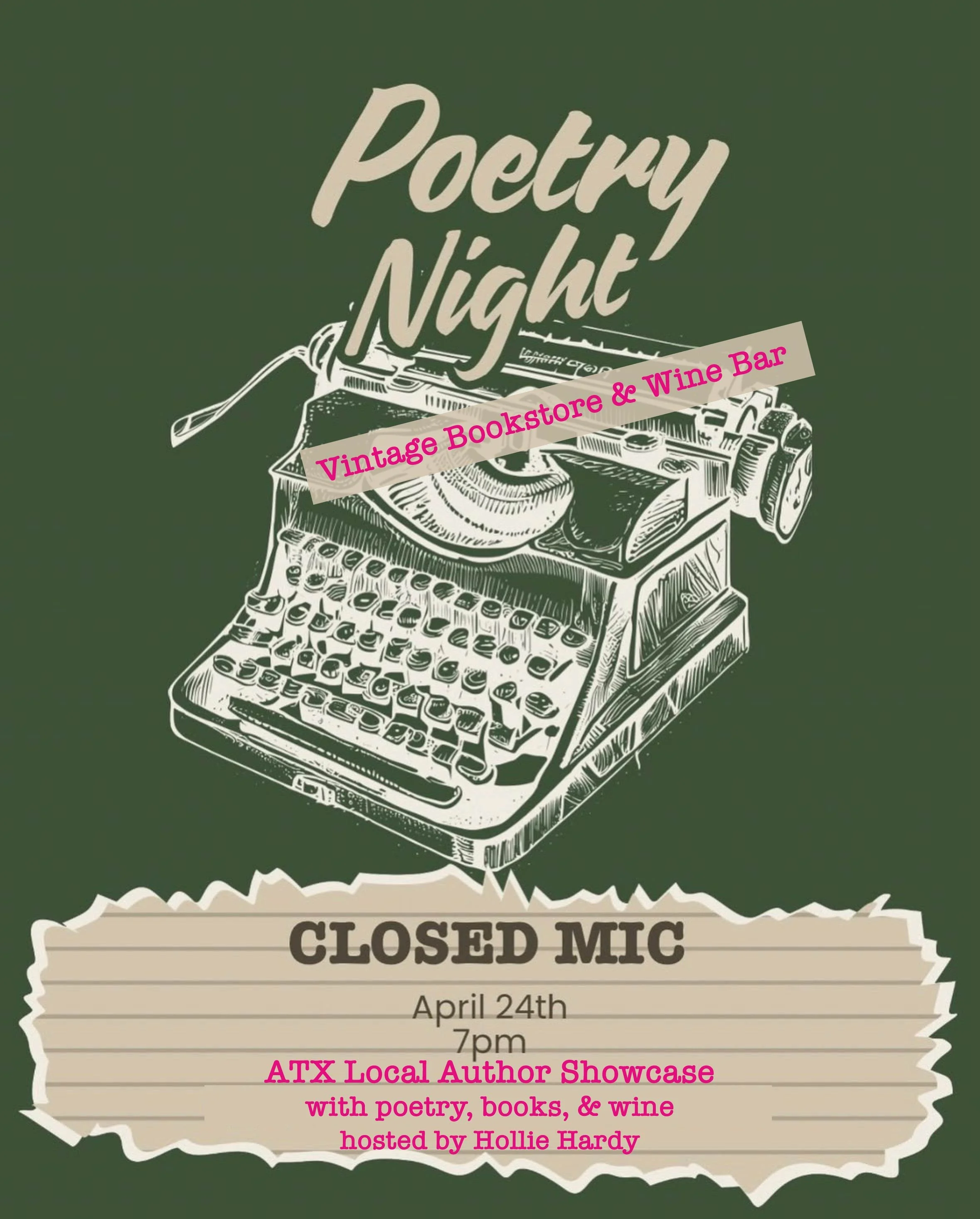 In celebration of National Poetry Month, Vintage Bookstore & Wine Bar hosts an evening poetry reading and book signing showcasing local Austin authors.