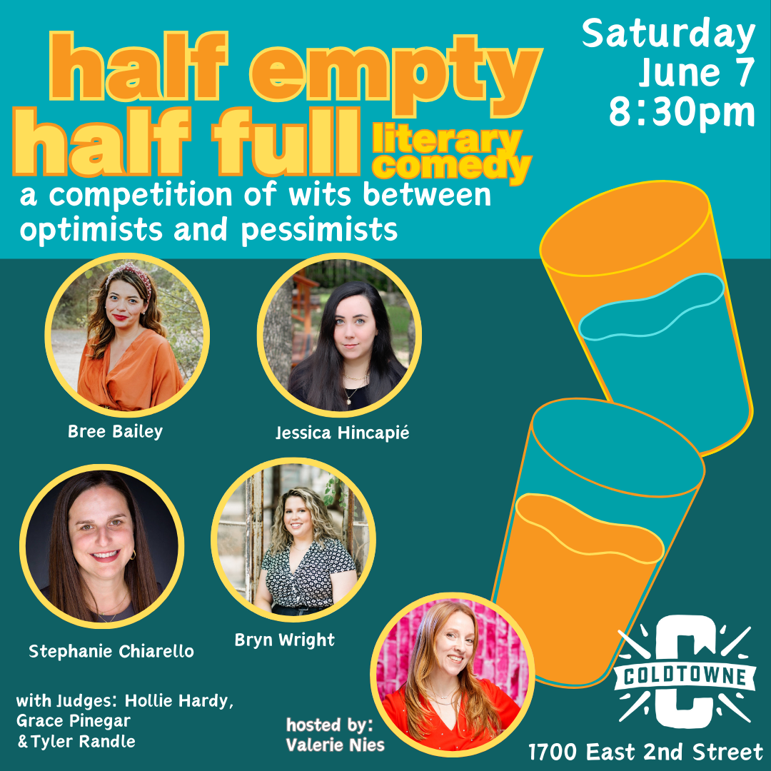 Half Empty Half Full is a literary comedy game show with a twist! Optimism versus pessimism—Austin's sharpest and wittiest stand-up comics and writers share their talents and compete to determine if the glass is half empty or half full. The show's host, comedian and poet Valerie Nies (McSweeney's, Rattle, and the comedy show Smile More), is joined by a panel of clever judges to choose who wins: the comedians and writers who see life half full or half empty!